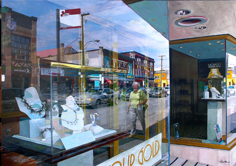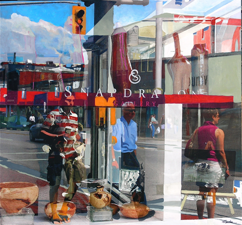 “My mixed media paintings are based on a marriage between my photographs and acrylic painting to create multi-media works on aluminum, coated with epoxy. They explore the ability of light to reflect, refract, creating both warped and representational images of objects, especially within digital media. Exaggerating this physical phenomenon so that others become interested, and indeed fascinated by it, has been an artistic goal of mine since I began painting.” Jennifer Lawton